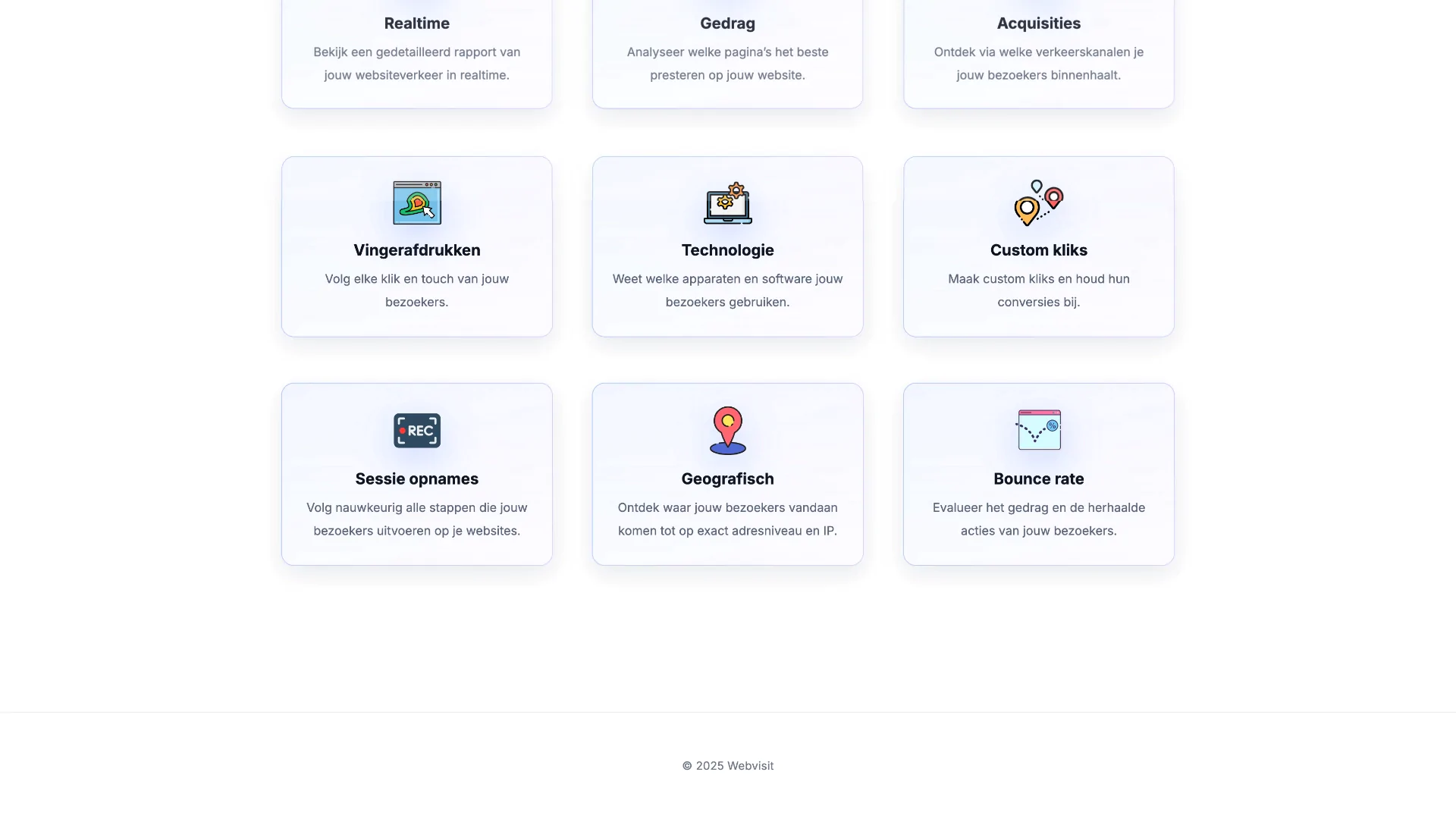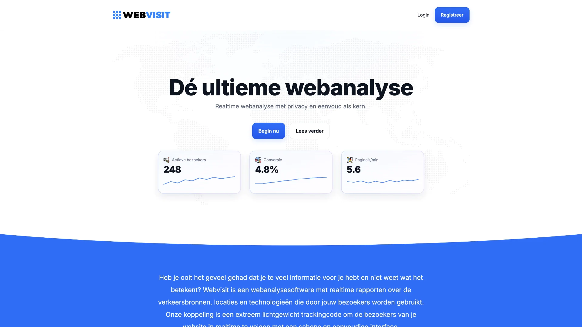 Heb je ooit het gevoel gehad dat je te veel informatie voor je hebt en niet weet wat het betekent? Webvisit is een webanalysesoftware met realtime rapporten over de verkeersbronnen, locaties en technologieën die door jouw bezoekers worden gebruikt. Onze koppeling is een extreem lichtgewicht trackingcode om de bezoekers van je website in realtime te volgen met een schone en eenvoudige interface.